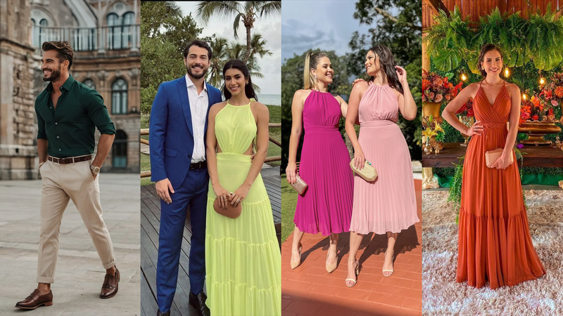 Vestido longo ou midi, com tecidos leves e fluidos, em tons pastéis ou vibrantes, com ou sem estampa. Só pedimos para evitarem roupas brancas, prateadas e creme/bege.